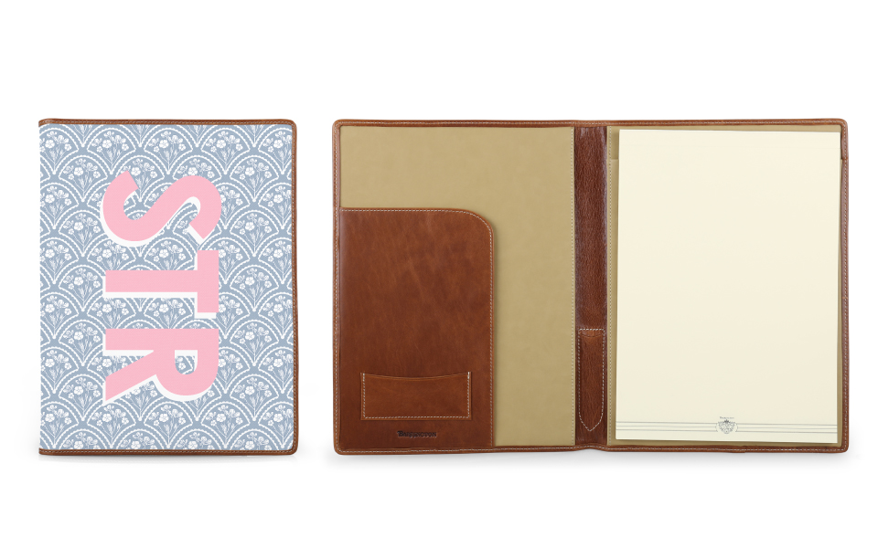 The Legal Pad Portfolio is the ideal accessory to take to a meeting, classroom, or keep at your office. Our Portfolio holds a standard 8.5“x 11” legal Pad to take notes, brainstorm ideas, or compose a letter. The handy flap pocket keeps loose papers in place and includes a pocket for business cards. Design your own by choosing the pattern, stripe, and monogram style that reflects your personality.
